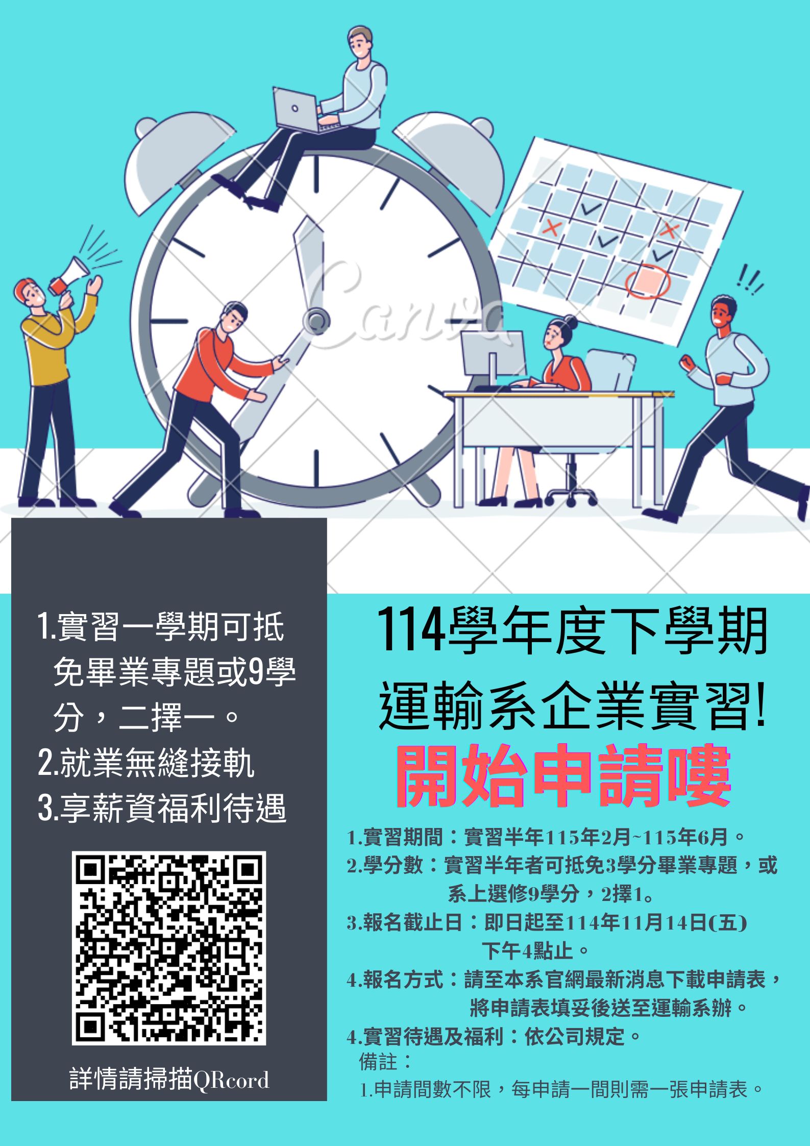 114學年度第2學期企業實習名額公告及開放申請至114年11月14日